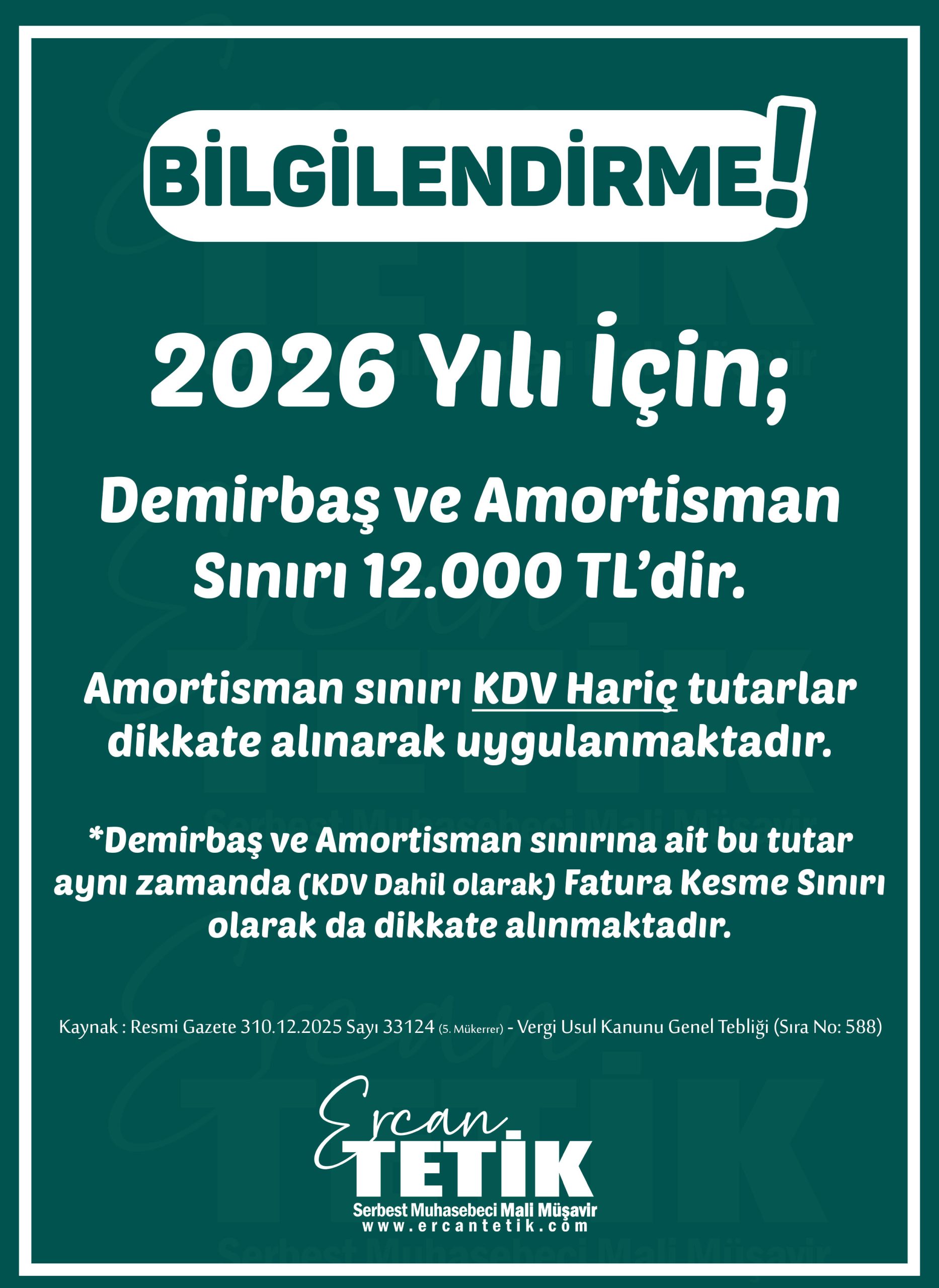2026 yılında uygulanacak Demirbaş ve Amortisman Sınırı KDV Hariç 12.000,00 TL olarak açıklandı.